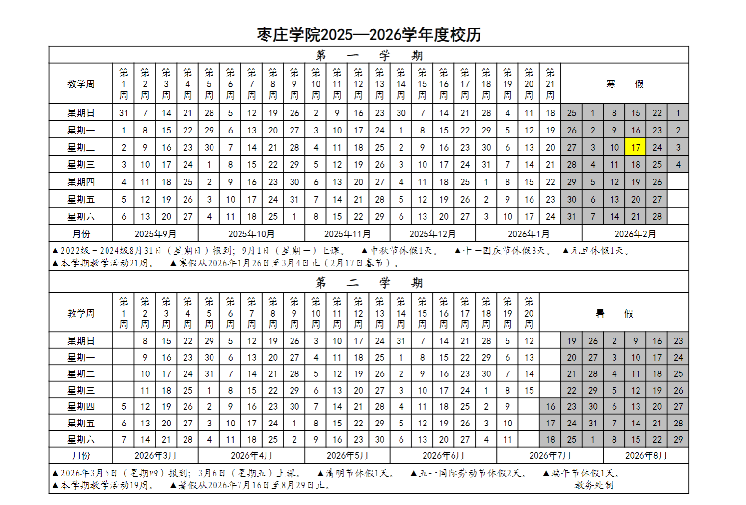 枣庄学院2025—2026学年度校历-枣庄学院教务处