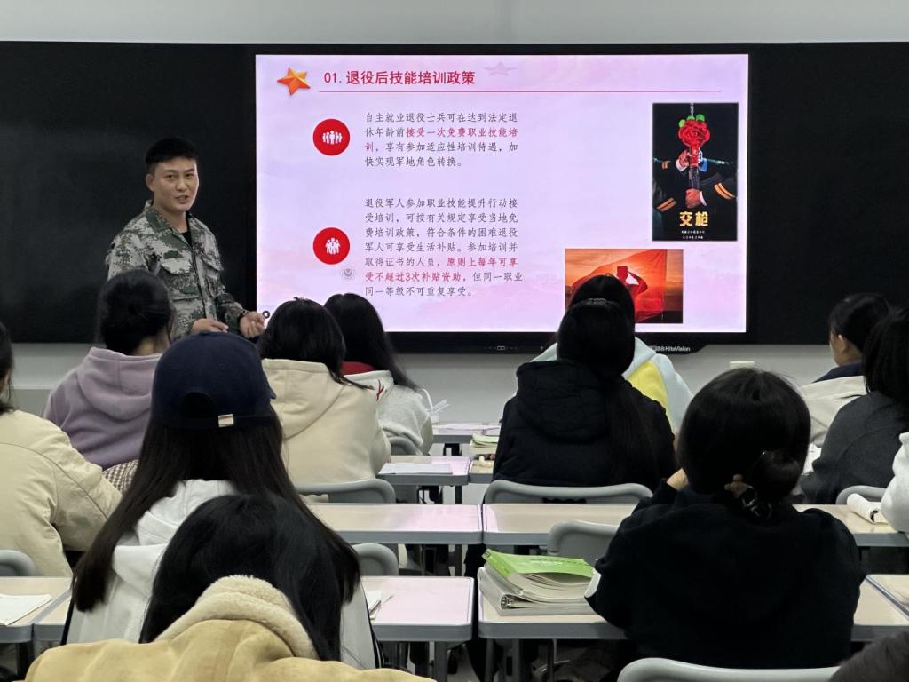 为深入贯彻落实国家征兵工作部署,厚植青年学子爱国强军情怀,10月23—27日,经济与管理学院组织开展以“青春军旅梦,报国正当时”为主题的征兵宣讲活动。活动特别邀请了学院三位优秀退伍军人代表组成宣讲团,通过政策解读、成长分享和互动答疑等形式,为25级新生带来了一场生动的国防教育课。