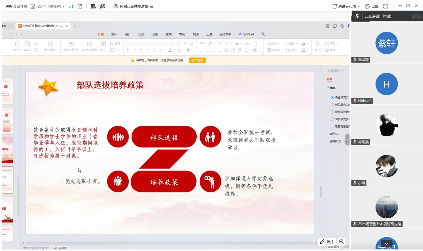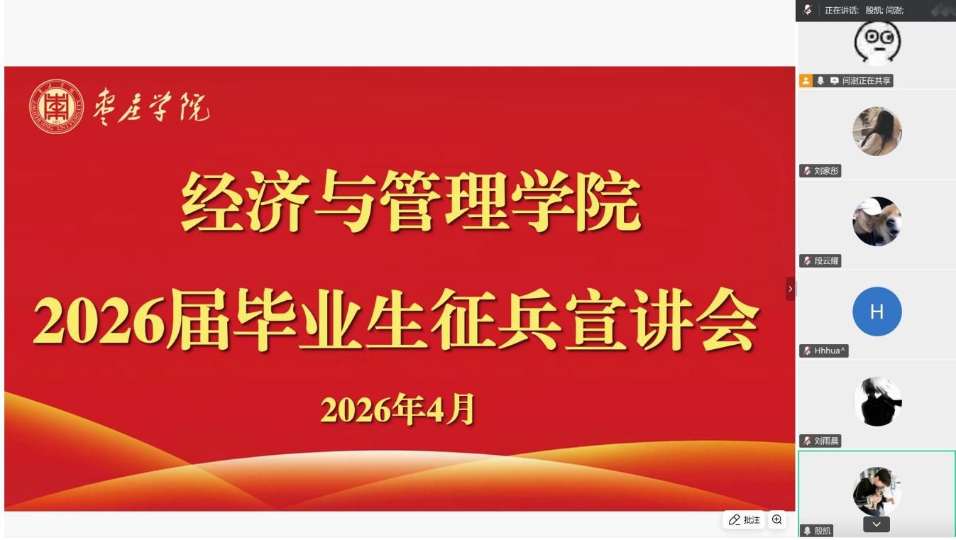 为积极响应国家征兵号召,进一步激发2026届毕业生的参军报国热情,4月2日晚,经济与管理学院召开2026届毕业生征兵专题线上宣讲会。学院优秀退役学生代表担任主讲,学院负责老师及全体2026届毕业生共同参与。